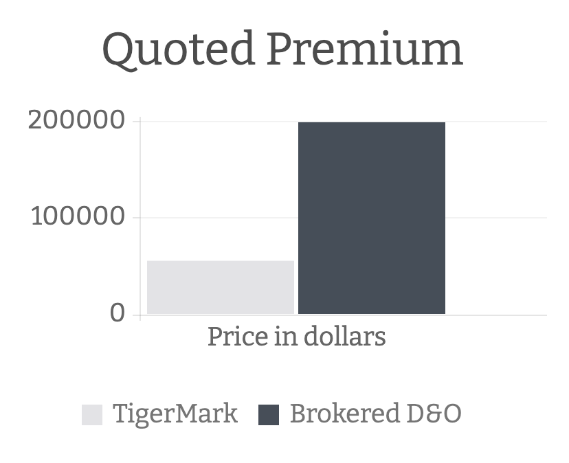 Assurely placed the additional $XM (retracted for privacy) of coverage in conjunction with the contractual requirement. The TigerMark insurance policy supported their investor risk needs, satisfied both their Board requirements and contractual obligations. It did not include a meaningful deductible. The custom program was all placed within two weeks and aggregate savings were 72% less premium while increasing the coverage levels.